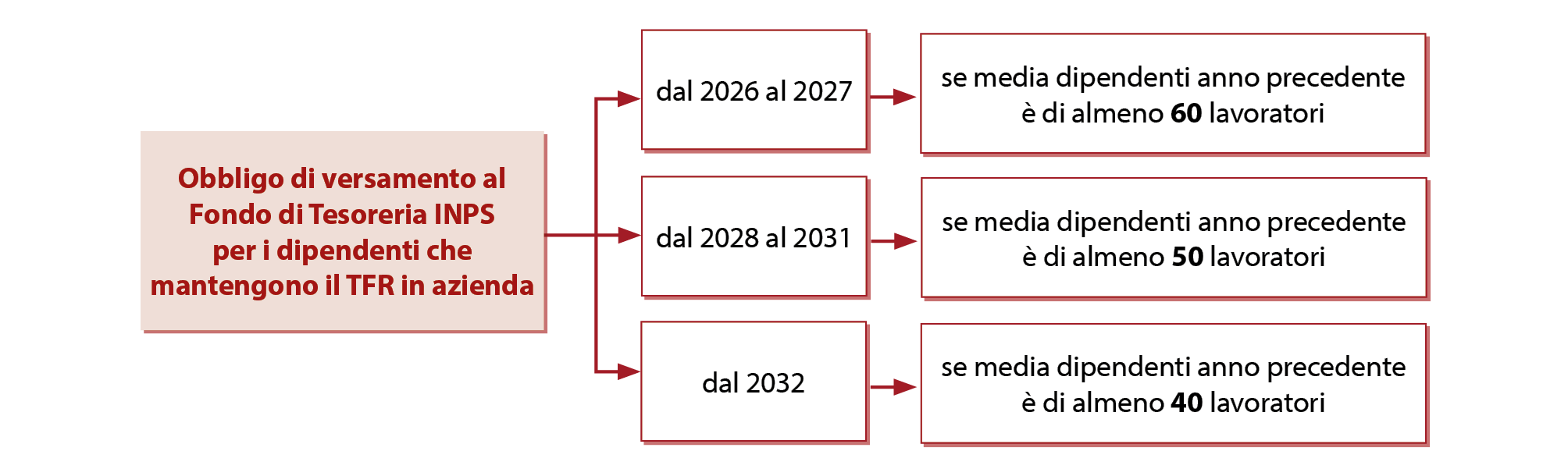 L’effetto della nuova norma, per gli anni 2026 e 2027, non opera qualora la media annuale (del relativo anno precedente) sia inferiore a sessanta lavoratori dipendenti . Con effetto sui periodi di retribuzione decorrenti dal 1° gennaio 2032 , è prevista la riduzione a quaranta del numero di lavoratori dipendenti a partire dal quale, per il datore di lavoro, si applica l’obbligo di versamento del TFR al Fondo di Tesoreria INPS (fermo restando il suddetto riferimento alla media annuale dell’anno precedente all’anno di volta in volta in corso). Le modifiche apportate dalla Legge di Bilancio 2026 non hanno effetto sui lavoratori che già hanno scelto di destinare il TFR ad una forma pensionistica complementare . Con riferimento a tali lavoratori, pertanto, i datori di lavoro continuano a non avere alcun obbligo di versamento del TFR al Fondo di Tesoreria INPS. |